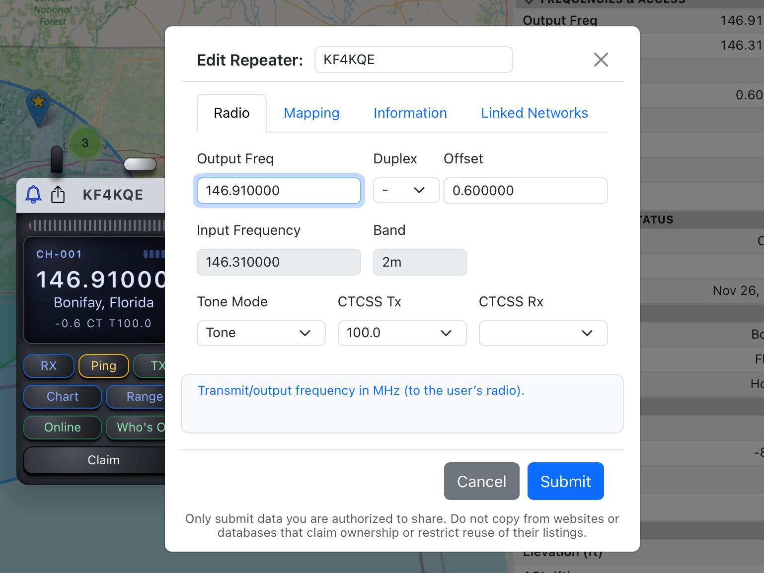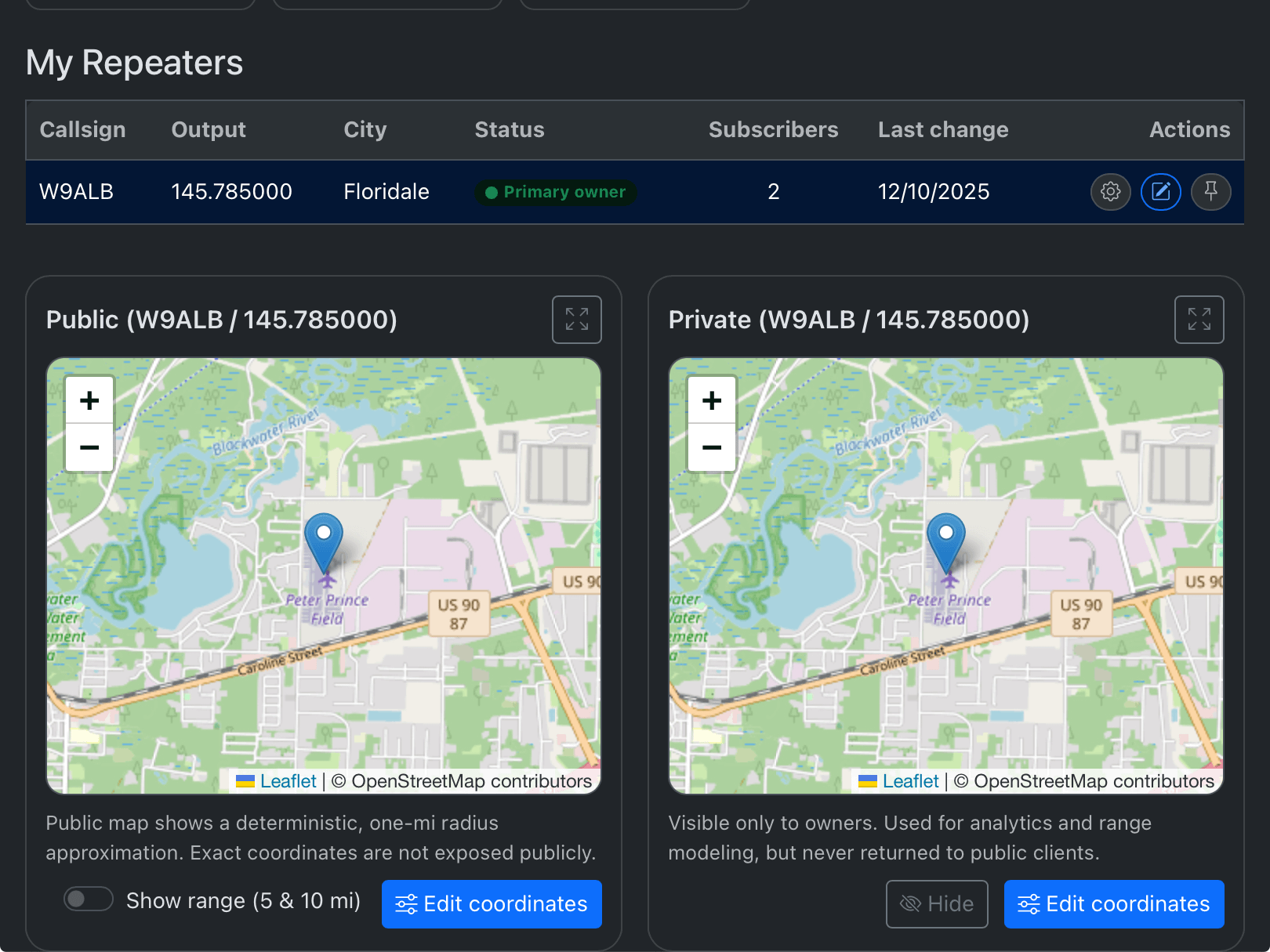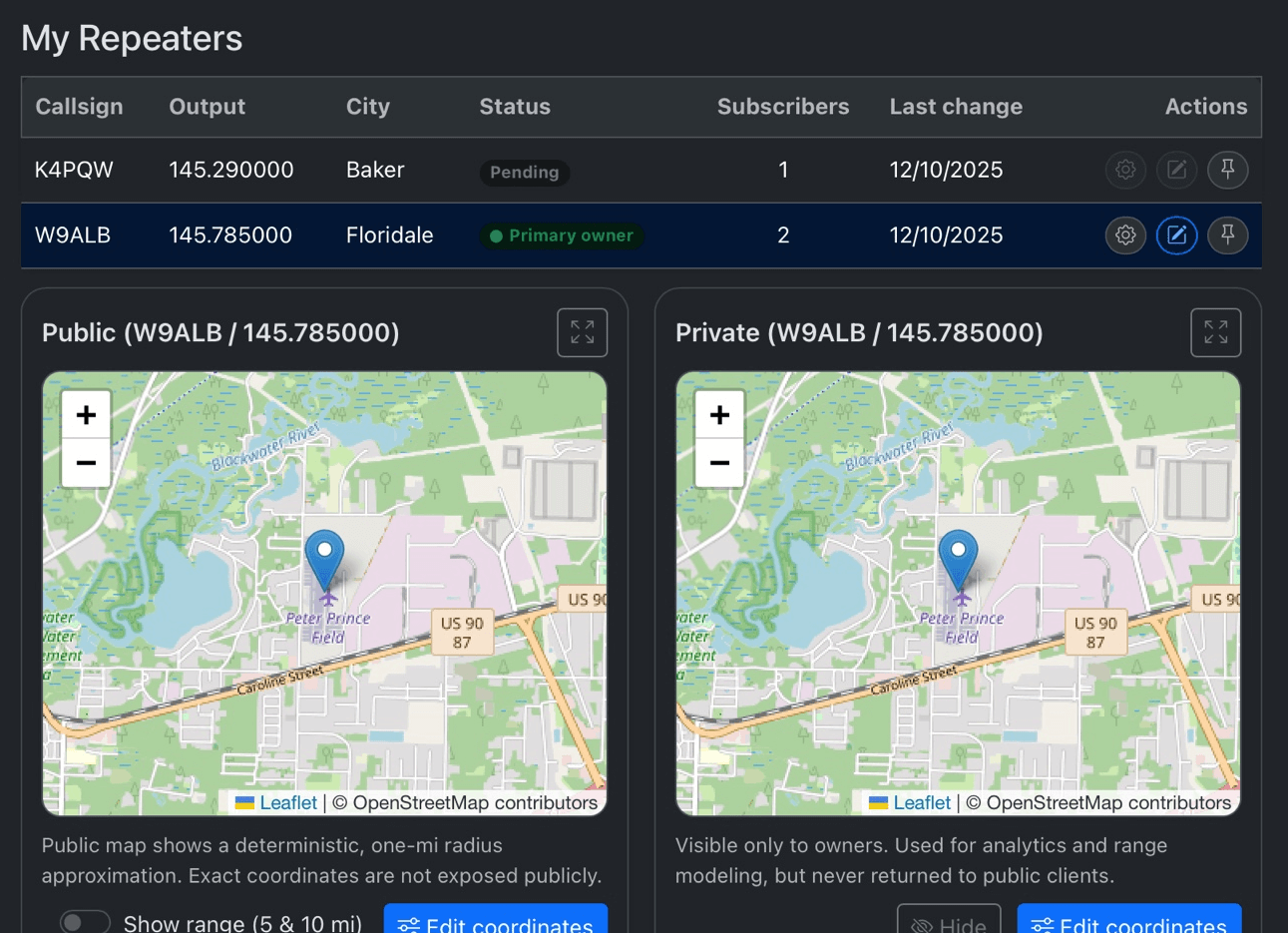 Claim, manage, and verify your repeater data directly — with separate Public and Private latitude/longitude coordinates.